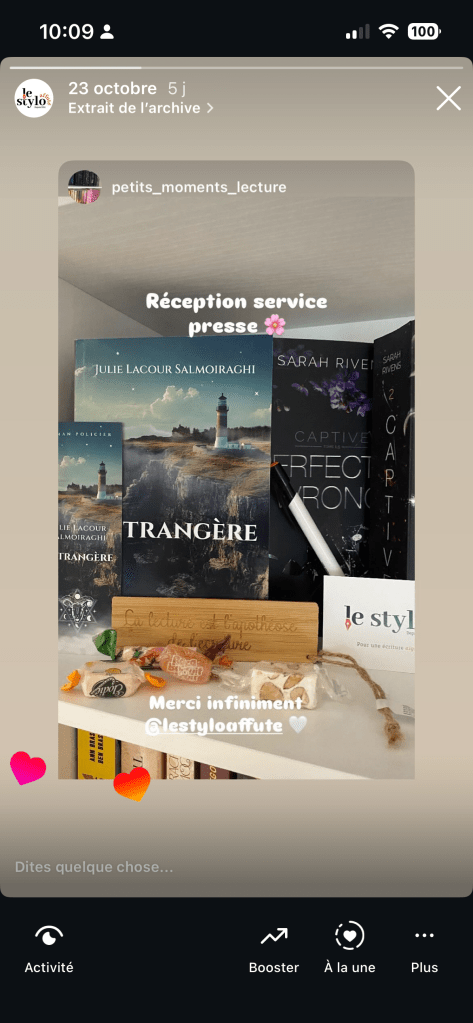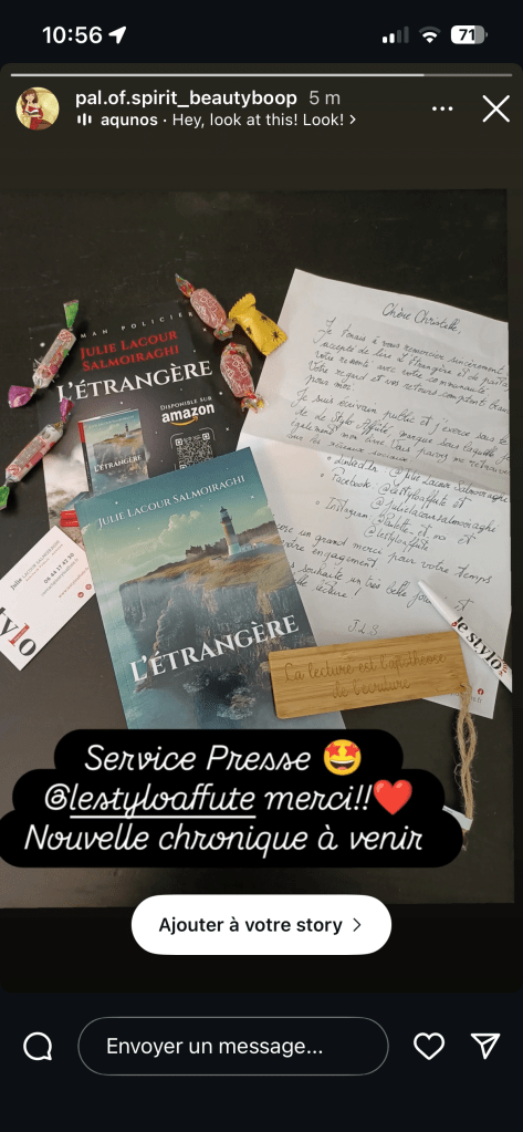 Envie d’une dédicace, d’une discussion autour de l’écriture, ou juste d’un moment sympa autour de mon roman L’Étrangère ?