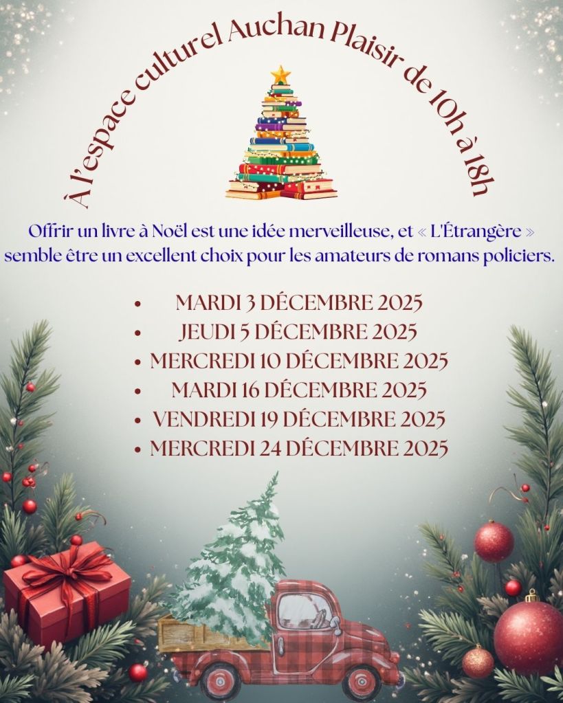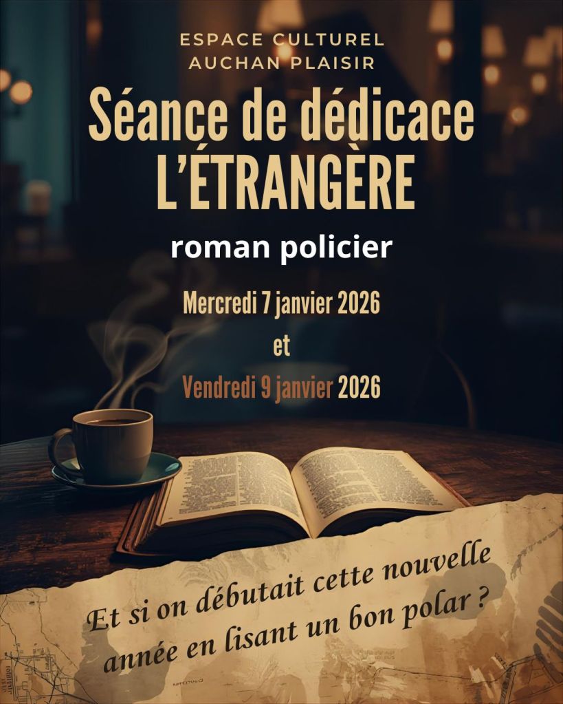 Je vous donne rendez-vous pendant deux jours au centre commercial de Plaisir (côté Auchan) pour échanger avec vous et dédicacer votre exemplaire de L’Étrangère.